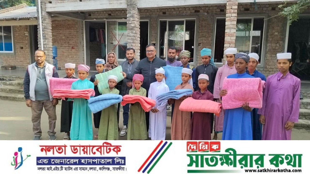 সাতক্ষীরার কালিগঞ্জ উপজেলার চাম্পাফুল ইউনিয়নের নবীননগর ফালাহে দারাঈন তাহফীজুল কুরআন ও নূরানী মাদ্রাসার শীতার্ত শিক্ষার্থীদের মুখে উষ্ণতার হাসি ফুটলো প্রবাসী মো. আলাউদ্দিন গাজীর মানবিক সহযোগিতা। তাঁর উদ্যোগে শীতার্ত শিক্ষার্থীদের মাঝে কম্বল বিতরণ করা হয়। সোমবার (৮ ডিসেম্বর ২০২৫) বেলা ১১টায় মাদ্রাসা প্রাঙ্গণে আয়োজিত অনুষ্ঠানে আনুষ্ঠানিকভাবে ১০ জন শিক্ষার্থীর হাতে কম্বল তুলে দেওয়া হয়। শৈত্যপ্রবাহের এই সময়ে এসব কোমলমতি শিক্ষার্থীদের জন্য কম্বল যেন উষ্ণতার পাশাপাশি অনুপ্রেরণার বার্তাও বয়ে এনেছে। অনুষ্ঠানে প্রধান অতিথি হিসেবে উপস্থিত ছিলেন কালিগঞ্জ উপজেলা বিএনপির সাবেক ছাত্র বিষয়ক সম্পাদক ও বিষ্ণুপুর ইউনিয়ন পরিষদের চেয়ারম্যান জাহাঙ্গীর আলম। এছাড়াও উপস্থিত ছিলেন ইউপি সদস্য লাইলী পারভীন, ব্যবসায়ী শেখ সিরাজুল ইসলাম, এবং মাদ্রাসার শিক্ষকবৃন্দ।