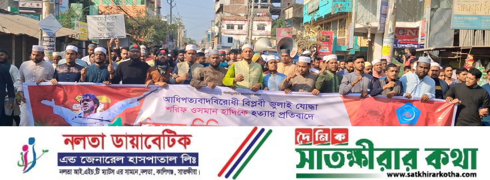 ইনকিলাব মঞ্চের মুখপাত্র শরীফ ওসমান হাদীর মৃত্যুতে সাতক্ষীরায় সর্বদলীয় ছাত্রদের উদ্যোগে গায়েবানা জানাজা ও বিক্ষোভ সমাবেশ অনুষ্ঠিত হয়েছে।